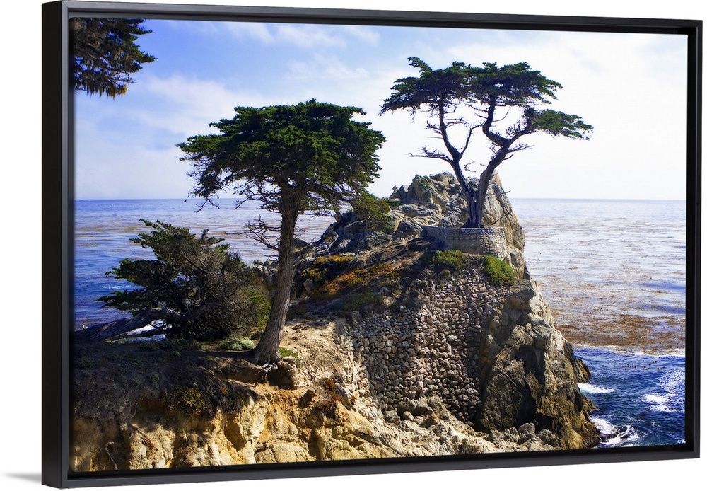 <p>Photograph of a solitary tree atop a cliff overlooking the water in California.</p>