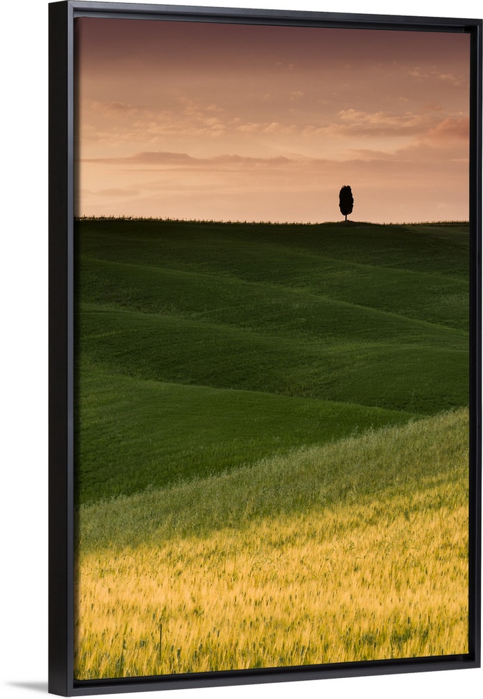 <p>A photograph of a lone cypress tree seen in a Tuscan landscape with rolling green fields.</p>