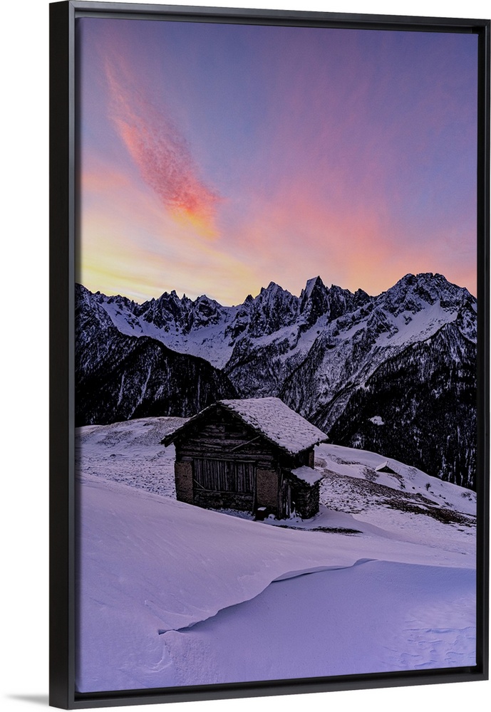 <p>Lone mountain hut in deep snow with majestic peaks in the background at dawn, Tombal, Val Bregaglia, Graubunden, Switzerland, Europe</p>