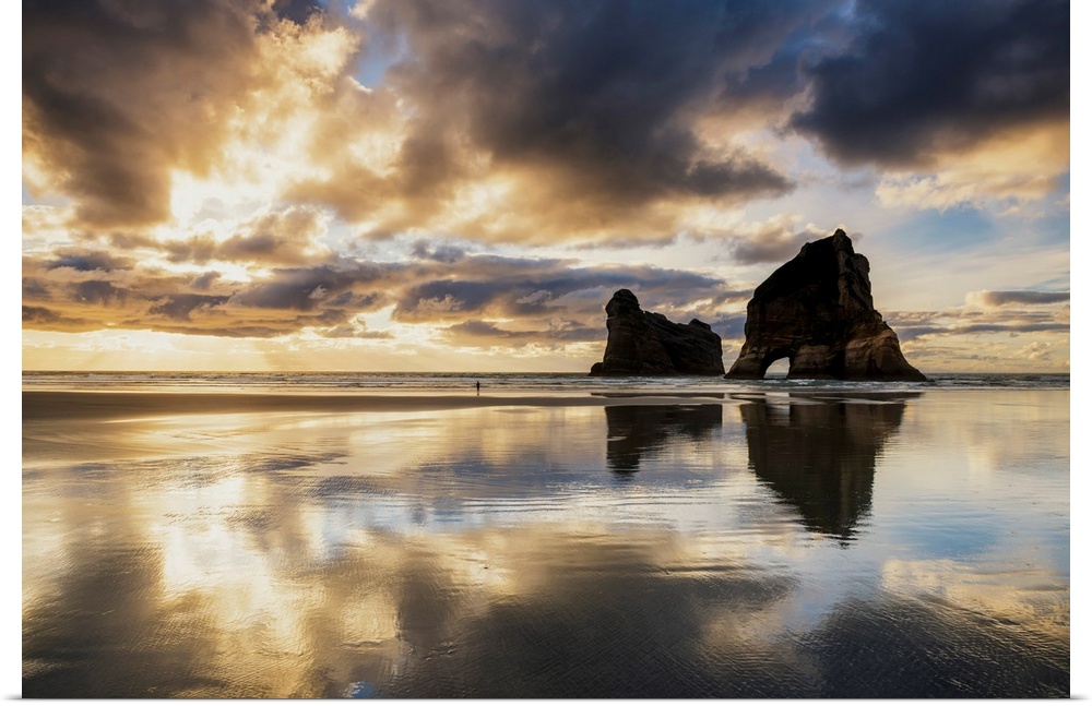 <p>Lone Person On Wharariki Beach At Sunset, New Zealand</p>