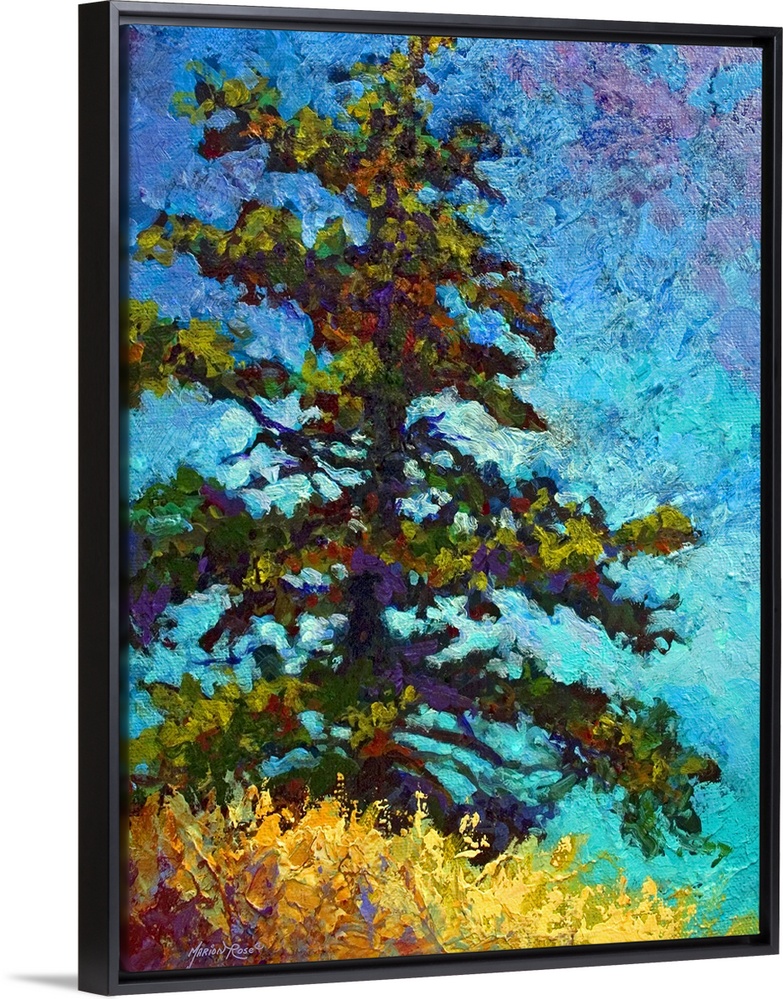 <p>Portrait painting for a living room or office of a single large pine tree on a hill of golden grasses, against a vibrant blue sky. Painted with thick, layered textures as seen with oil paints.</p>