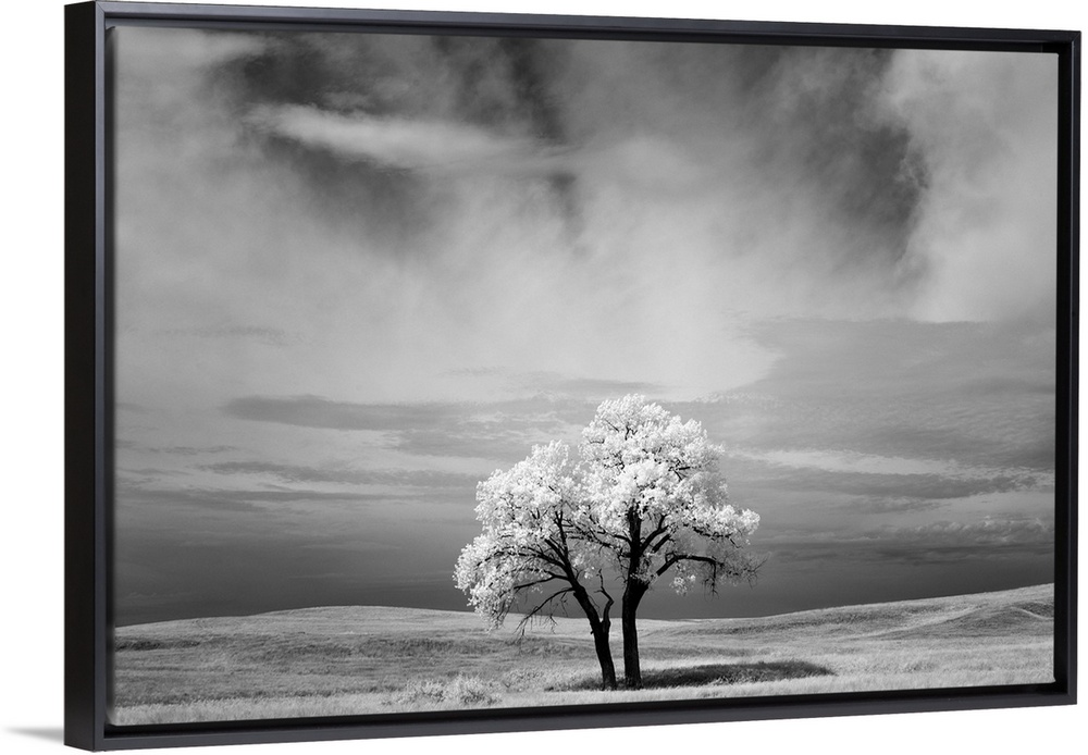 <p>Infrared image of a tree under a cloudy sky in the Badlands, South Dakota.</p>
