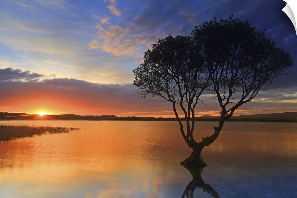 <p>Lone tree at sunset, Kenfig Pool, Kenfig Nature Reserve, South Wales, United Kingdom, Europe</p>