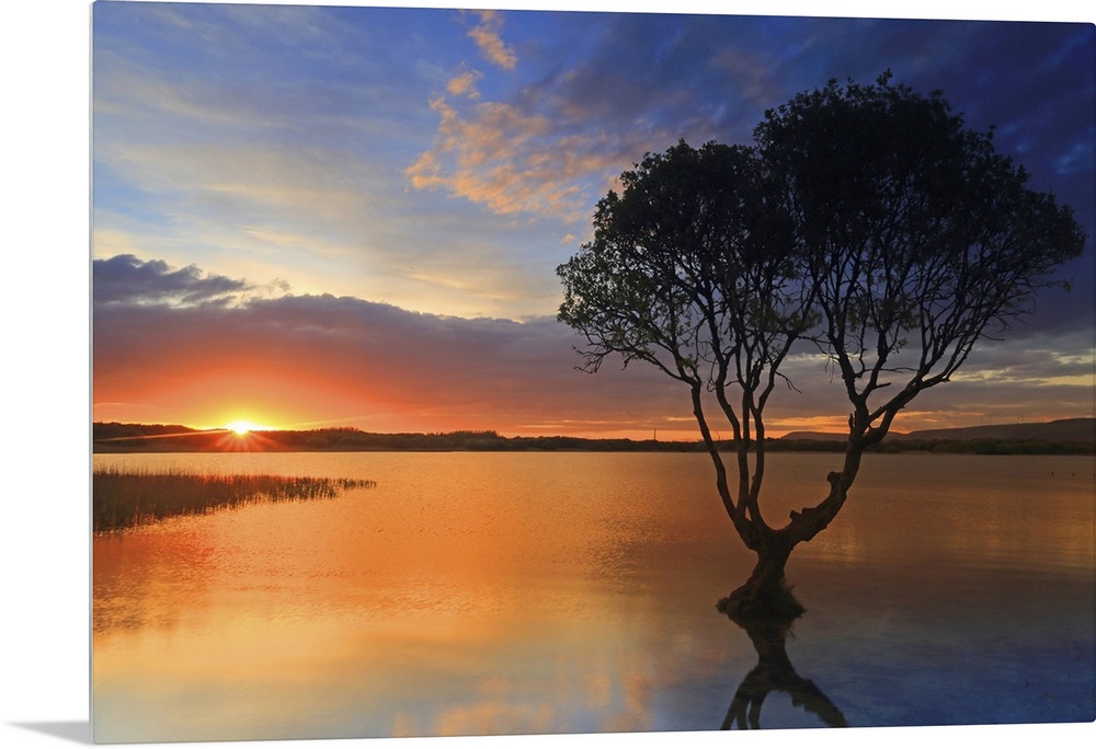 <p>Lone tree at sunset, Kenfig Pool, Kenfig Nature Reserve, South Wales, United Kingdom, Europe</p>