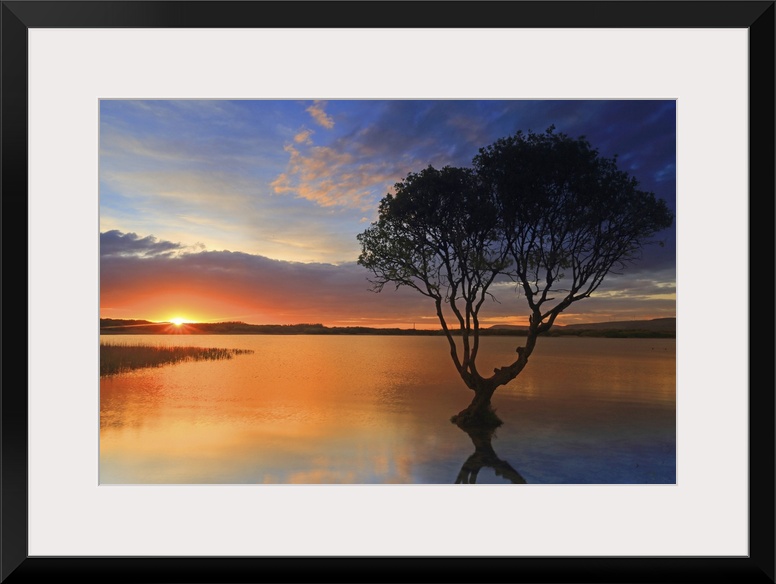 <p>Lone tree at sunset, Kenfig Pool, Kenfig Nature Reserve, South Wales, United Kingdom, Europe</p>