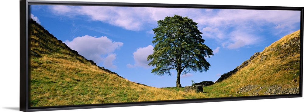 <p>Panoramic photograph of a lone tree against a blue sky with white clouds, in Sycamore Gap, alongside Hadrian's Wall in Northumberland England.</p>