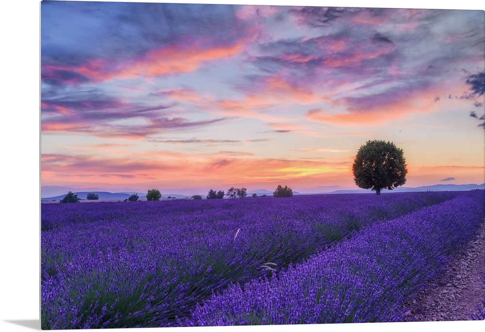 <p>Lone tree in Lavender field (Lavendula augustifolia) at sunset, Provence-Alpes-Cote d'Azur, Alpes de Haute Provence, Pullmosion, Valensole, Provence, Plateau de Valensole, France</p>