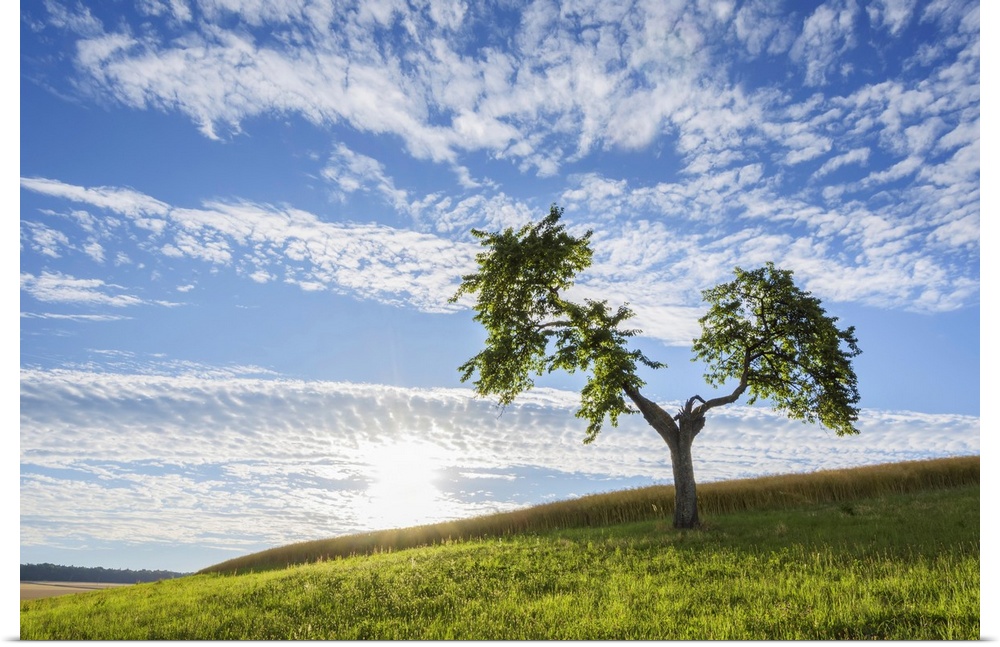 <p>Lone Tree in Meadow with Sun in Summer, Reichartshausen, Miltenberg District, Bavaria, Germany</p>