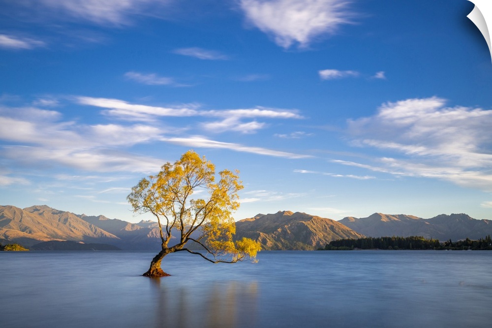 <p>Lone tree in Roys Bay on Wanaka Lake against sky during sunrise, Wanaka, Queenstown-lakes District, Otago Region, South Island, New Zealand</p>