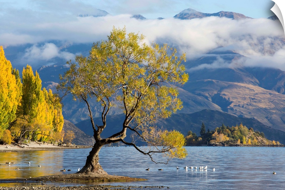 <p>Lone willow tree growing at the edge of Lake Wanaka, autumn, Roys Bay, Wanaka, Queenstown-Lakes district, Otago, South Island, New Zealand, Pacific</p>
