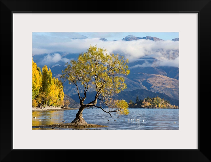 <p>Lone willow tree growing at the edge of Lake Wanaka, autumn, Roys Bay, Wanaka, Queenstown-Lakes district, Otago, South Island, New Zealand, Pacific</p>