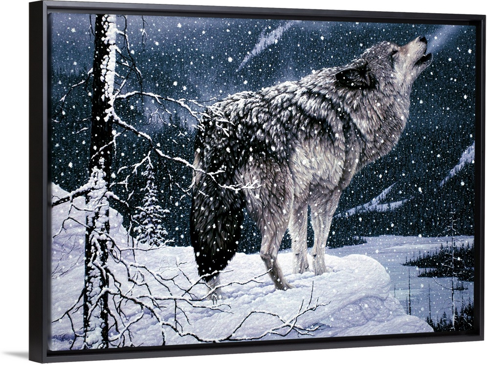 <p>a wolf on a snow covered ledge, next to a tree, howling winter</p>