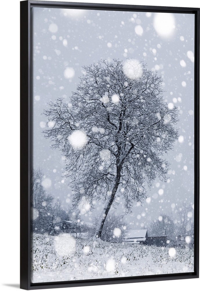 <p>Lonely bare tree under a snowfall, San Gregorio nelle Alpi, Belluno, Veneto, Italy</p>