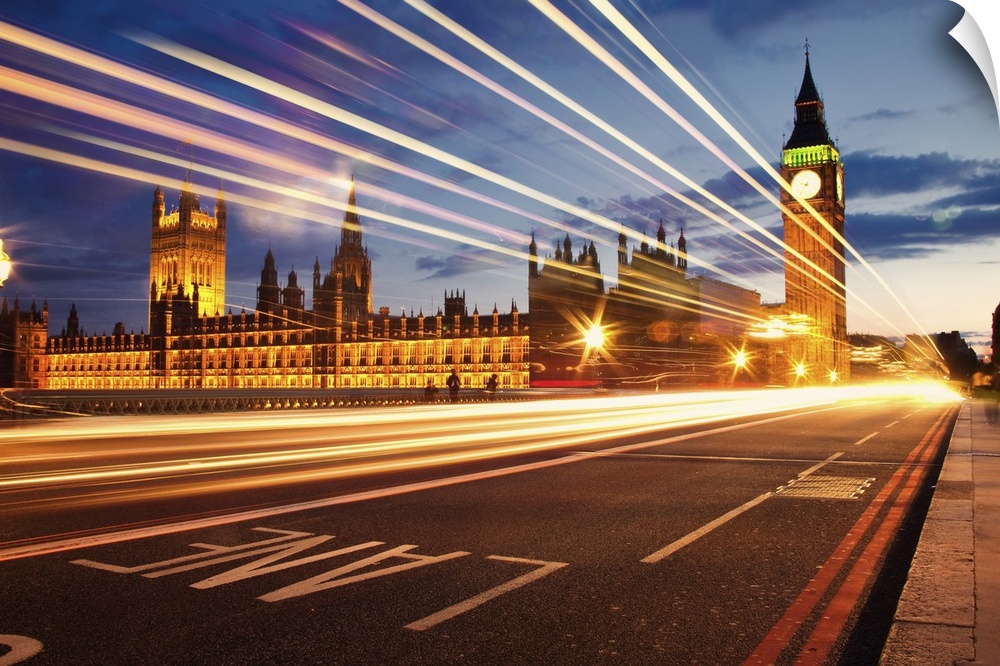 <p>Long exposure night time shot looking towards Big Ben and the Houses of Parliament, with light trails from passing London red buses.</p>