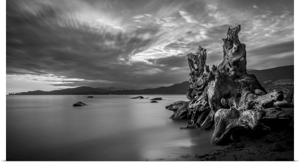 <p>Long exposure of driftwood at the water's edge and a view of the Vancouver coastline at Stanley Park, Vancouver, British Columbia, Canada.</p>
