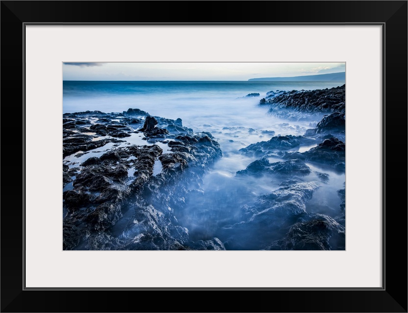 <p>Long exposure of tide pools along the coastline and a view of the Pacific Ocean; Makawao, Maui, Hawaii, United States of America</p>