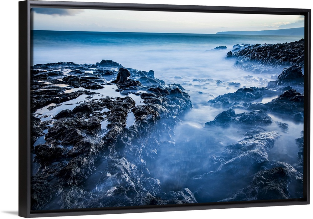 <p>Long exposure of tide pools along the coastline and a view of the Pacific Ocean; Makawao, Maui, Hawaii, United States of America</p>