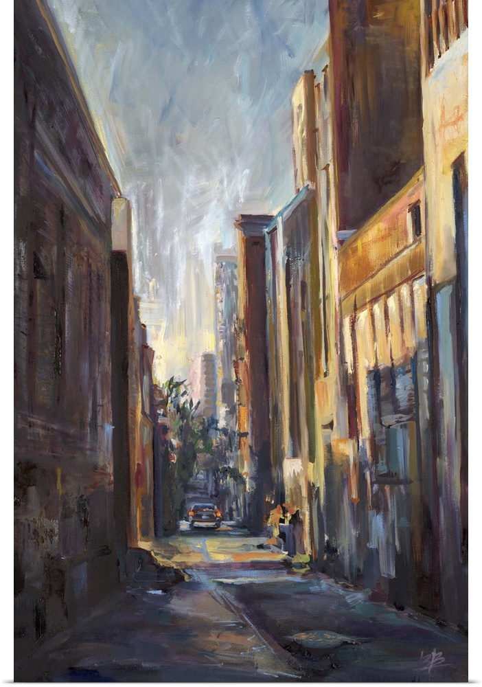 <p>Contemporary painting looking through a corridor of an urban block.</p>