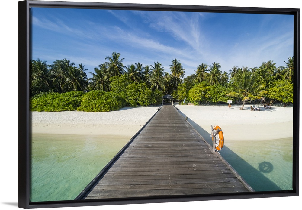 <p>Long pier leading to a small island over turquoise water, Sun Island Resort, Nalaguraidhoo island, Ari atoll, Maldives, Indian Ocean</p>