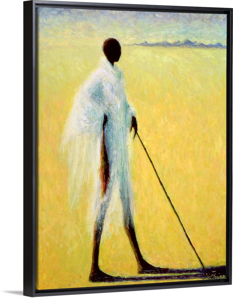 <p>A vertical impressionistic painting of a stylized and elongated black figure draped in wispy fabric stands in the desert leaning on a thin stick.</p>
