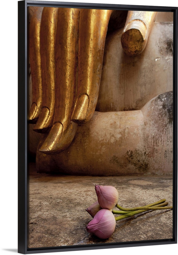 <p>Sukhothai Historical Park towards Northwest. Buddha long slender fingers of the Buddha with lily bud Sukhothai, Thailand.</p>