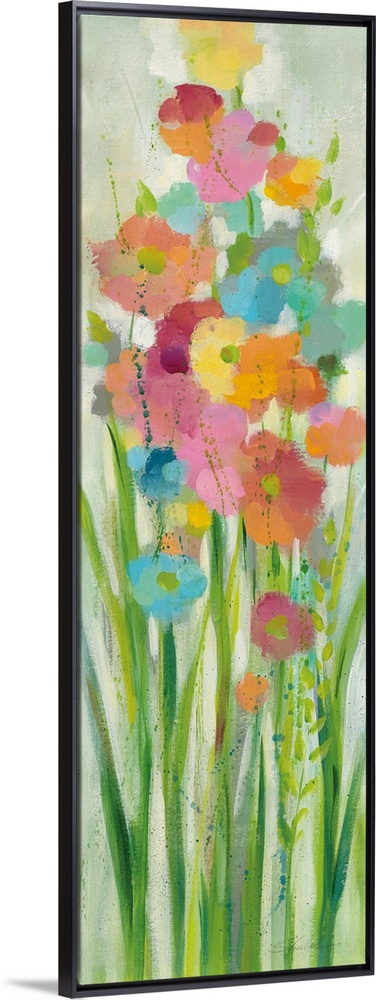 <p>A long vertical painting of a group of stemmed flowers and leaves in cheerful colors.</p>