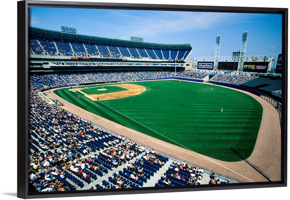 <p>Long view of Baseball diamond and bleachers during professional Baseball Game, Comiskey Park, Illinois</p>