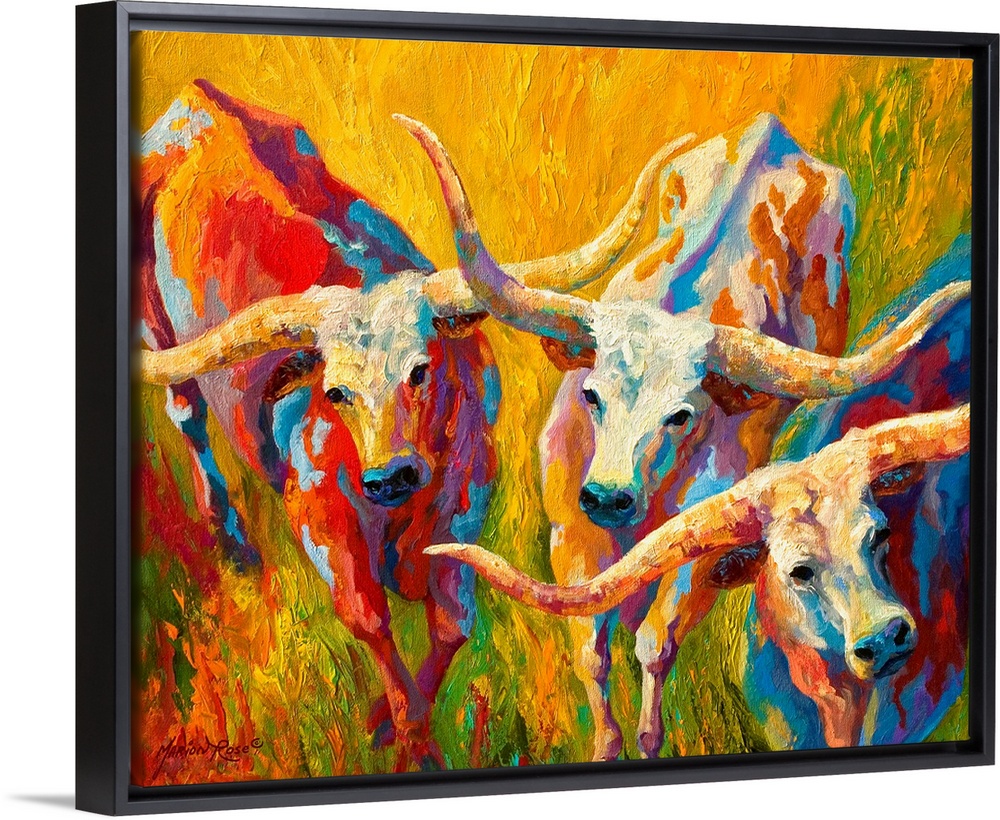 <p>Contemporary painting by Marion Rose of three longhorn cattle in a bright, grassy field.</p>