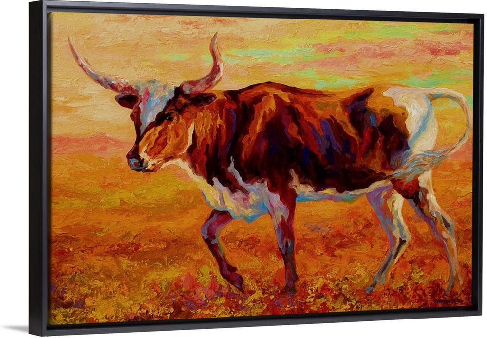 <p>Big painting of a bull on canvas with a warm sunlight tone.</p>