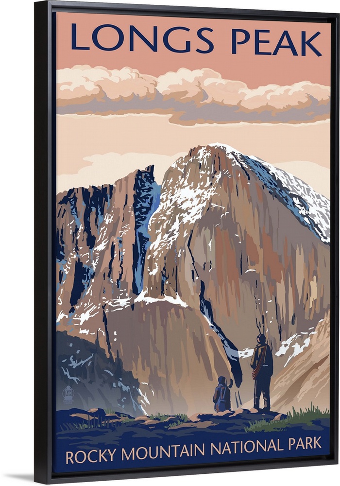 <p>Retro stylized art poster of two hikers gazing out over a mountainous valley.</p>
