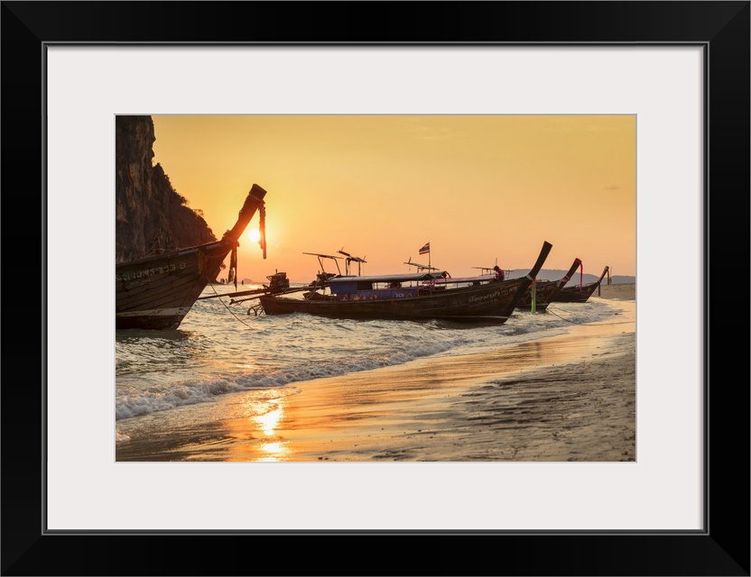 <p>Longtail boats at Phra Nang Beach at sunset, Rai Leh Peninsula, Krabi Province, Thailand, Southeast Asia, Asia</p>