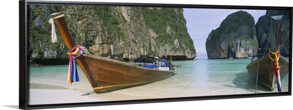 <p>Panoramic photograph of two big canoes docked in sand at the shoreline with huge rock formations in the distance.</p>