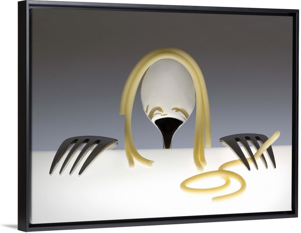 <p>Conceptual image of a spoon and two forks resembling a person, playing with spaghetti.</p>