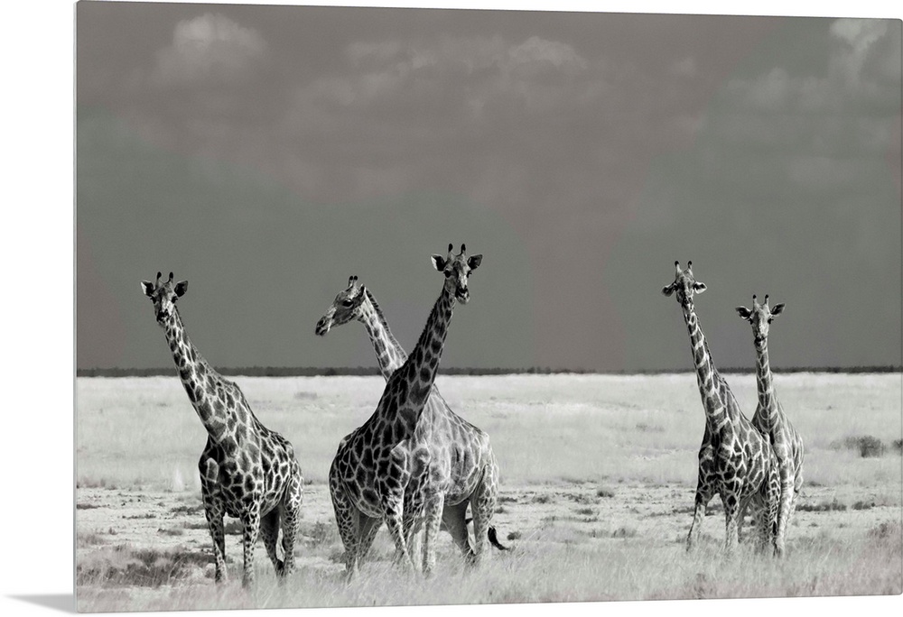 <p>A black and white photograph of a group of a giraffes standing around in the Savannah.</p>