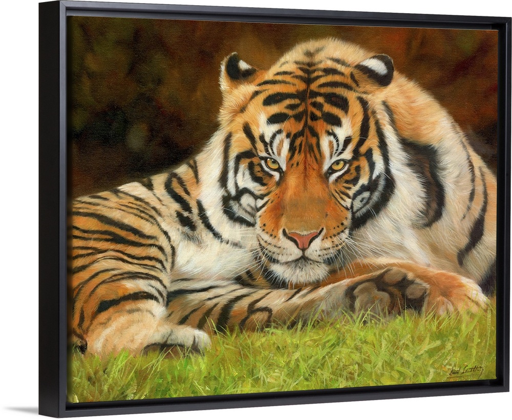 <p>Painting of a tiger laying on the grass looking proud and majestic.</p>