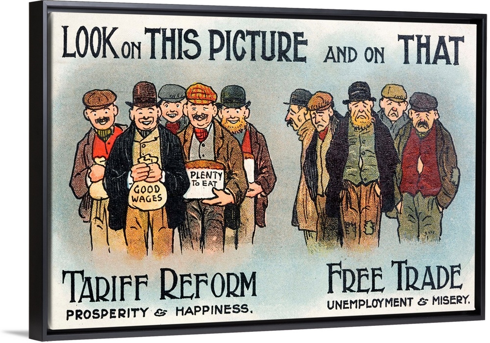 <p>Smiling faces greet tarrif reform which is claimed to bring good wages and plenty to eat, while free trade is depicted as bringing unemployment and misery, illustrated by unhappy faces. The card is dated 1910, after the issue had split the Conservative party and resulted in a defeat to the Liberals in 1906.</p>
