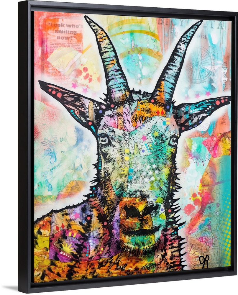 <p>Painted portrait of a goat on a colorfully designed background.</p>