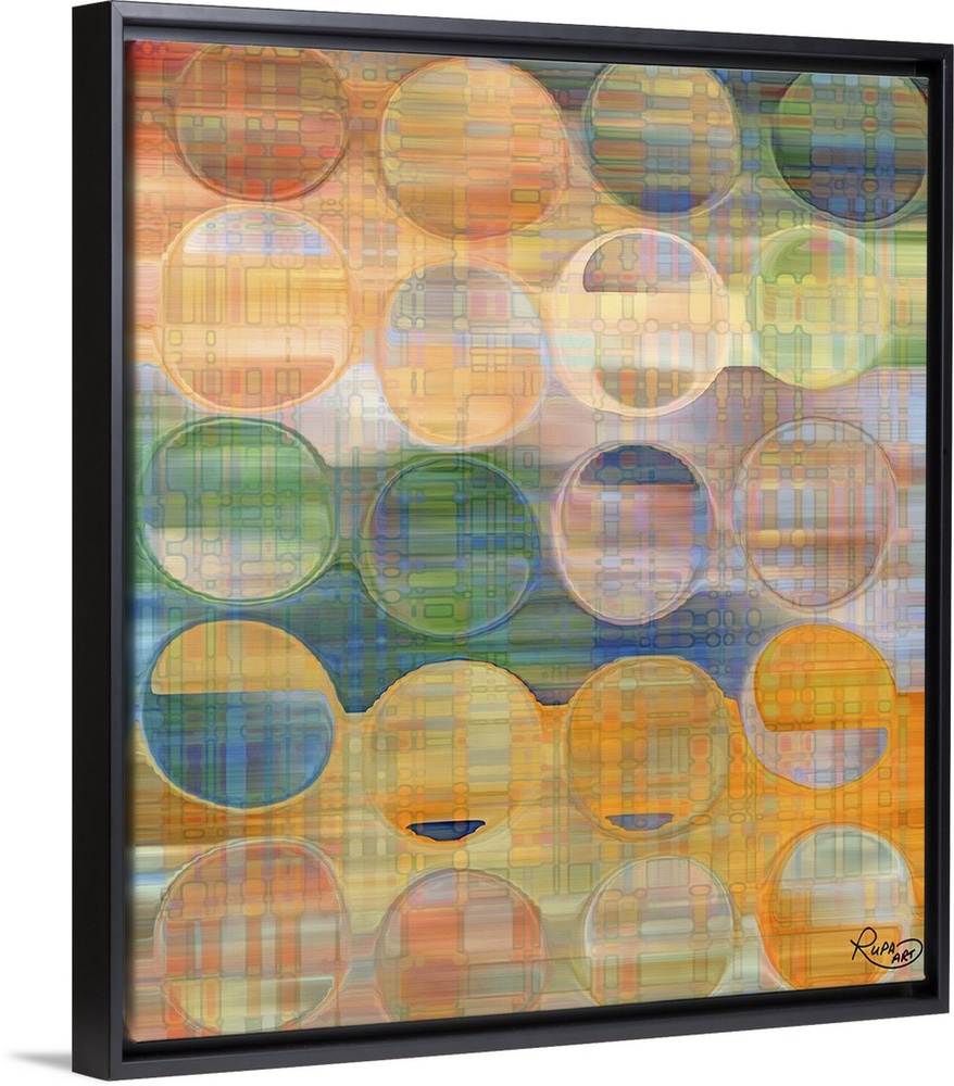 <p>Square abstract art with circles lined up in rows on top of a thin, plaid-like background.</p>