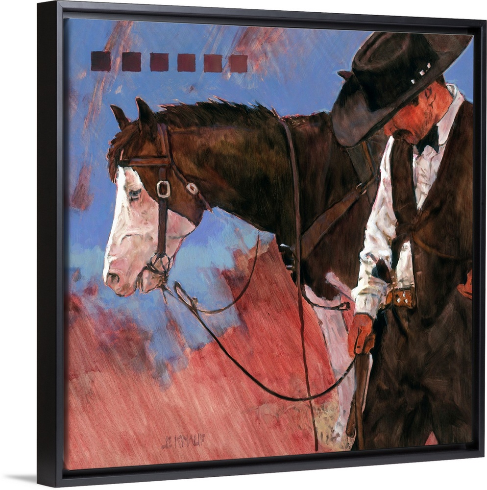 <p>Contemporary western theme painting of a cowboy standing beside his horse.</p>
