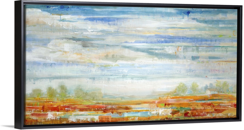<p>Contemporary landscape painting looking out over red fields under a vibrant blue cloudy sky.</p>