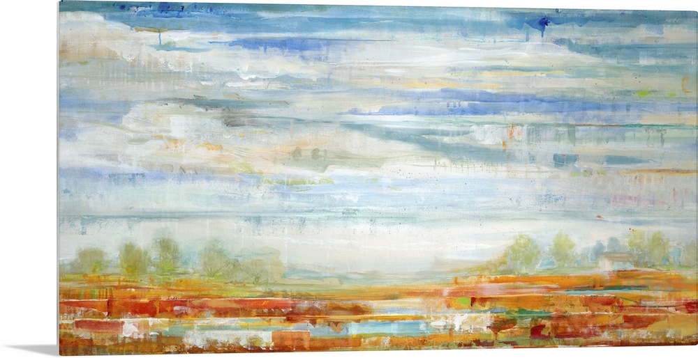 <p>Contemporary landscape painting looking out over red fields under a vibrant blue cloudy sky.</p>