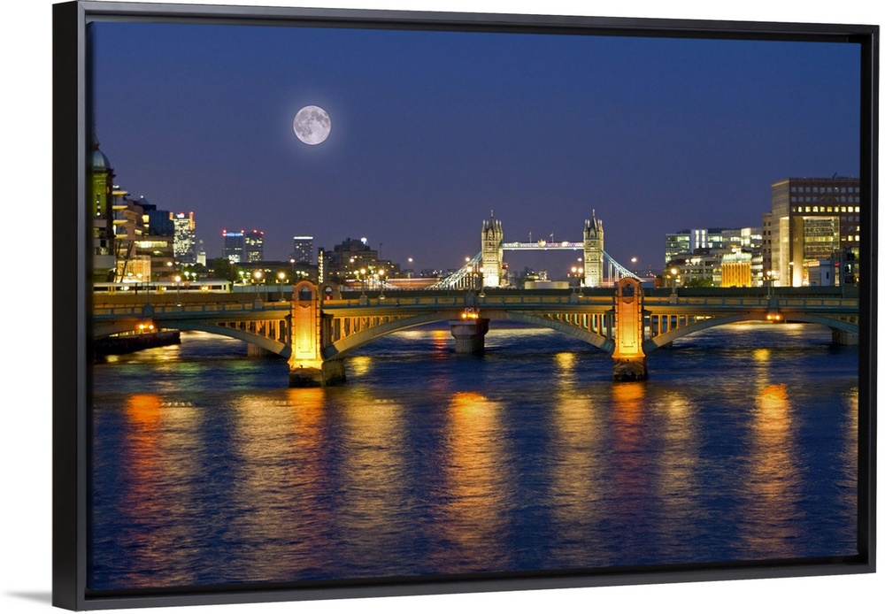 <p>Horizontal photograph on a giant wall hanging of the Millennium Footbridge, lit at night over the waters of the Thames, Tower Bridge and the city of London sit beneath a large moon in the background.</p>