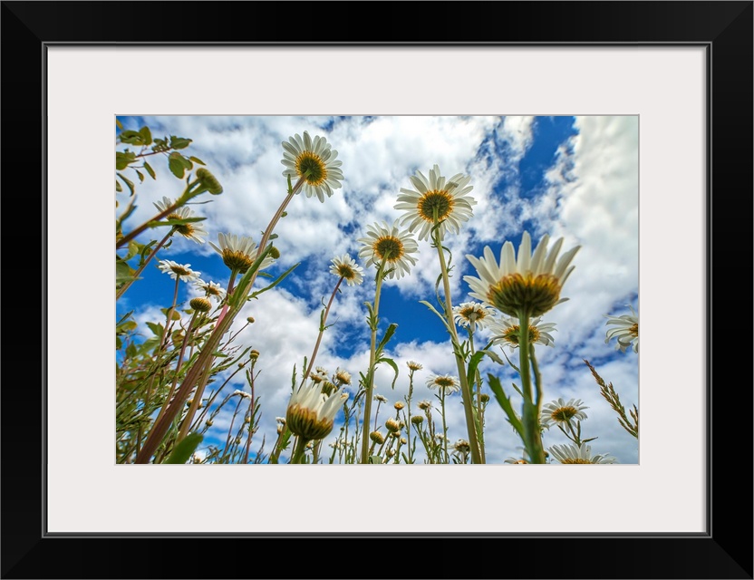 <p>Looking up at daisies (Bellis pernnis) for a unique perspective, British Columbia, Canada.</p>