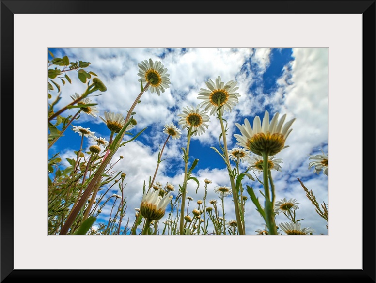 <p>Looking up at daisies (Bellis pernnis) for a unique perspective, British Columbia, Canada.</p>