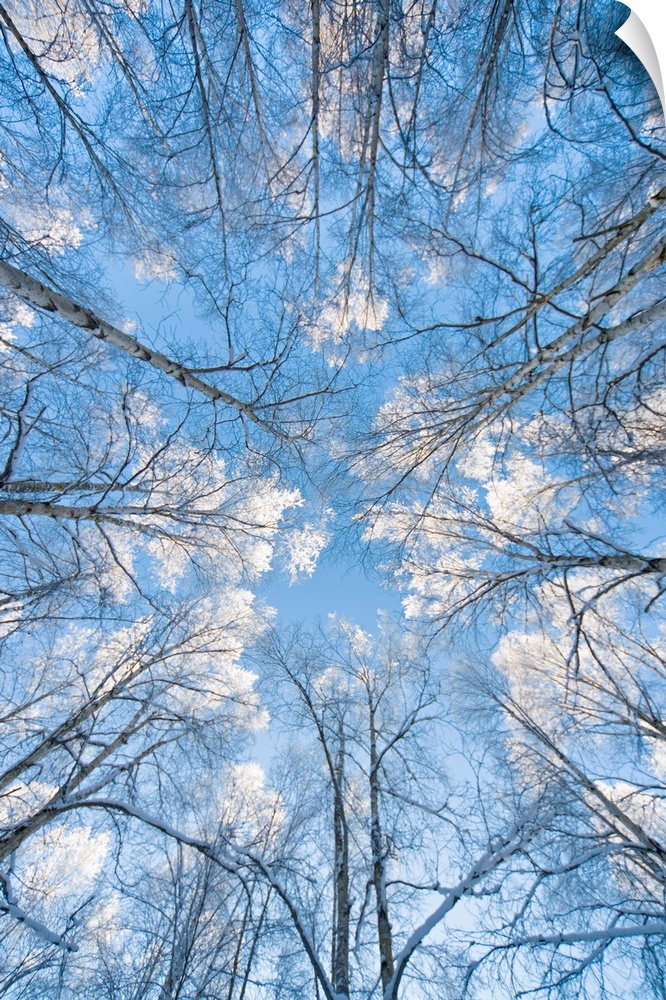 <p>Huge photograph taken from the ground pointing upward shows the tops of bare trees extending into a bright sky scattered with clouds.</p>