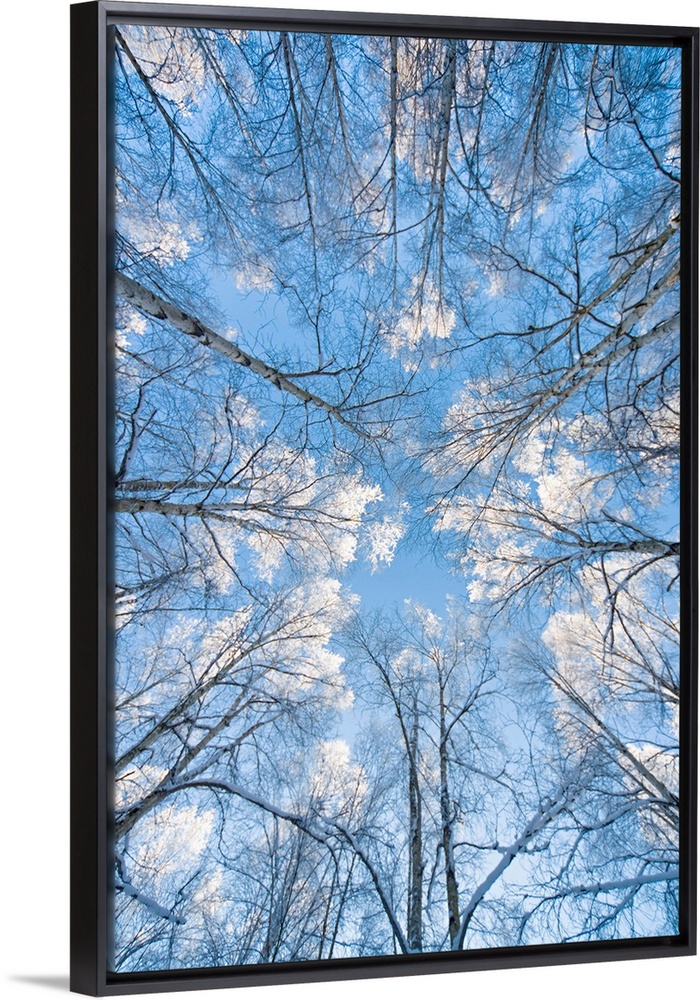 <p>Huge photograph taken from the ground pointing upward shows the tops of bare trees extending into a bright sky scattered with clouds.</p>