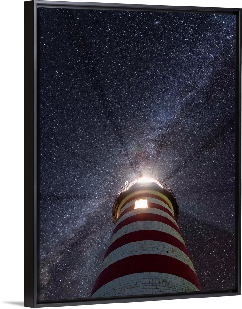 <p>Photograph looking up at a red and white striped lighthouse to a purple and blue starry sky with the Milky Way running diagonally through the sky.</p>
