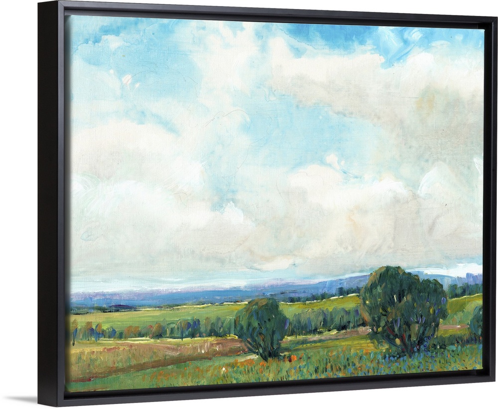 <p>This contemporary artwork features short vertical brush strokes to create this lively countryside landscape with soft clouds above.</p>