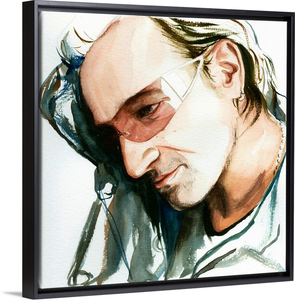 <p>Vertigo-era Bono in a loose watercolor portrait, one of four band members.</p>