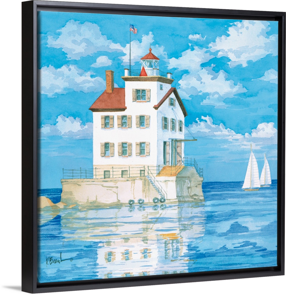 <p>Contemporary painting of a lighthouse reflected in Lake Erie.</p>